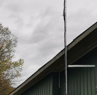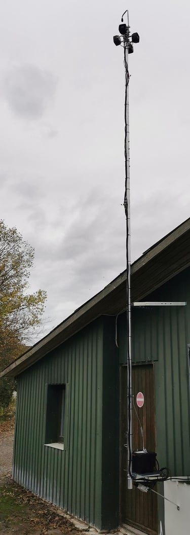 Um große Areale mit dem Laser zu schützen, muss der Laser in die Höhe. Dies kann eine Montage auf dem Dach oder auf einen Pfosten sein, der dann entsprechend abgespannt wird.