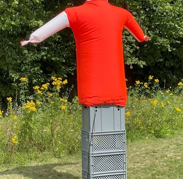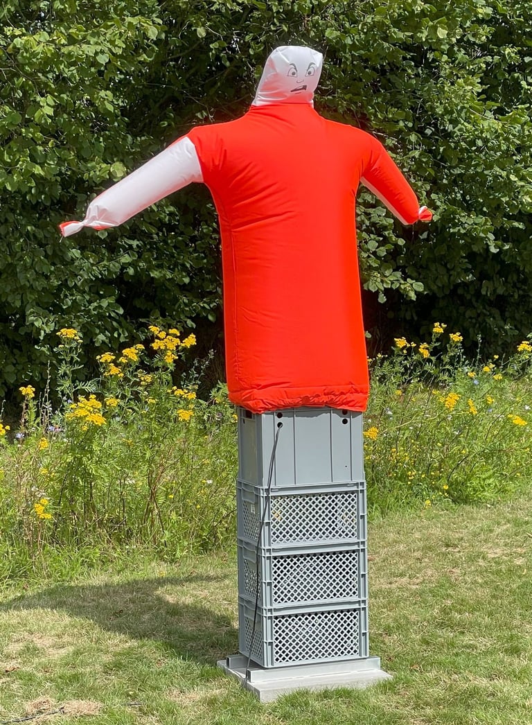 Der Scareman ist eine aufblasbare Vogelscheuche und ergänzt das BirdAlert um eine visuelle Komponente. Wir stellen den Scareman zusätzlich auf Boxen, um die Figur auf eine stattliche Höhe von 2,40 m zu bringen. Durch die Kombination verschiedener Vergrämungsmittel und die einstellbaren Variablen wird die Wirksamkeit der Vergrämung enorm gesteigert.